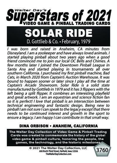 A subset of the Superstars of 2021, Our Pinball Legacy series of trading cards celebrates the 90th anniversary of the birth of coin-operated pinball (1931-2021). To honor this tremendous legacy, we invited more than 400 pinball aficianados to pose with their favorite pinball game for a trading card. And, on the back of the card, they wrote a 150-200 word biography, telling the story of their love for pinball while including in the text historical facts about the machine.