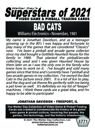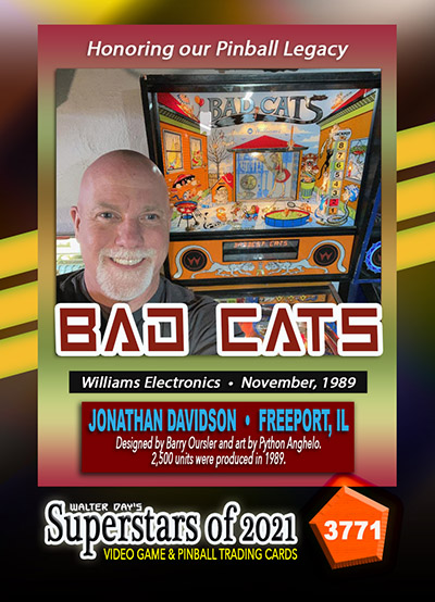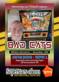 A subset of the Superstars of 2021, Our Pinball Legacy series of trading cards celebrates the 90th anniversary of the birth of coin-operated pinball (1931-2021). To honor this tremendous legacy, we invited more than 400 pinball aficianados to pose with their favorite pinball game for a trading card. And, on the back of the card, they wrote a 150-200 word biography, telling the story of their love for pinball while including in the text historical facts about the machine.
