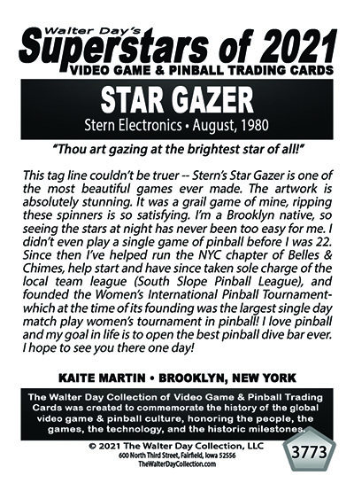 A subset of the Superstars of 2021, Our Pinball Legacy series of trading cards celebrates the 90th anniversary of the birth of coin-operated pinball (1931-2021). To honor this tremendous legacy, we invited more than 400 pinball aficianados to pose with their favorite pinball game for a trading card. And, on the back of the card, they wrote a 150-200 word biography, telling the story of their love for pinball while including in the text historical facts about the machine.