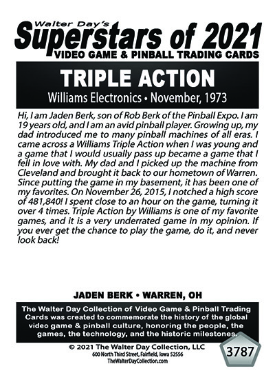 A subset of the Superstars of 2021, Our Pinball Legacy series of trading cards celebrates the 90th anniversary of the birth of coin-operated pinball (1931-2021). To honor this tremendous legacy, we invited more than 400 pinball aficianados to pose with their favorite pinball game for a trading card. And, on the back of the card, they wrote a 150-200 word biography, telling the story of their love for pinball while including in the text historical facts about the machine.