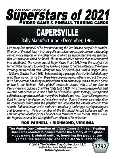 A subset of the Superstars of 2021, Our Pinball Legacy series of trading cards celebrates the 90th anniversary of the birth of coin-operated pinball (1931-2021). To honor this tremendous legacy, we invited more than 400 pinball aficianados to pose with their favorite pinball game for a trading card. And, on the back of the card, they wrote a 150-200 word biography, telling the story of their love for pinball while including in the text historical facts about the machine.