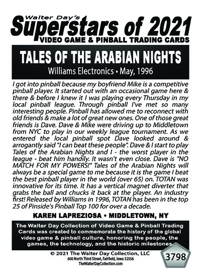 A subset of the Superstars of 2021, Our Pinball Legacy series of trading cards celebrates the 90th anniversary of the birth of coin-operated pinball (1931-2021). To honor this tremendous legacy, we invited more than 400 pinball aficianados to pose with their favorite pinball game for a trading card. And, on the back of the card, they wrote a 150-200 word biography, telling the story of their love for pinball while including in the text historical facts about the machine.