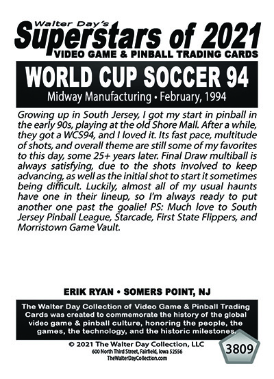 A subset of the Superstars of 2021, Our Pinball Legacy series of trading cards celebrates the 90th anniversary of the birth of coin-operated pinball (1931-2021). To honor this tremendous legacy, we invited more than 400 pinball aficionados to pose with their favorite pinball game for a trading card. And, on the back of the card, they wrote a 150-200 word biography, telling the story of their love for pinball while including in the text historical facts about the machine.