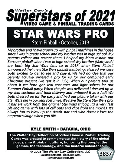 A subset of the Superstars of 2021, Our Pinball Legacy series of trading cards celebrates the 90th anniversary of the birth of coin-operated pinball (1931-2021). To honor this tremendous legacy, we invited more than 400 pinball aficionados to pose with their favorite pinball game for a trading card. And, on the back of the card, they wrote a 150-200 word biography, telling the story of their love for pinball while including in the text historical facts about the machine.