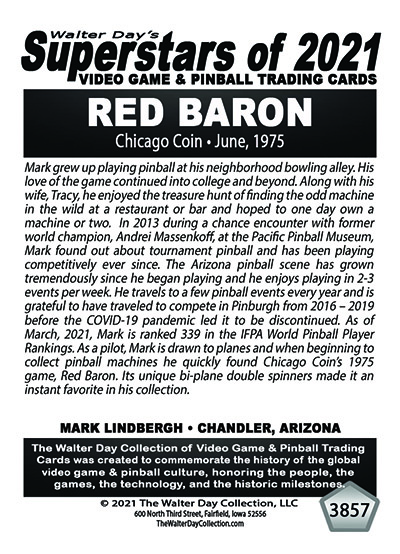 Other Notes: A subset of the Superstars of 2021, Our Pinball Legacy series of trading cards celebrates the 90th anniversary of the birth of coin-operated pinball (1931-2021). To honor this tremendous legacy, we invited more than 400 pinball aficionados to pose with their favorite pinball game for a trading card. And, on the back of the card, they wrote a 150-200 word biography, telling the story of their love for pinball while including in the text historical facts about the machine.