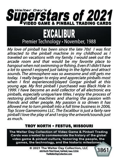 A subset of the Superstars of 2021, Our Pinball Legacy series of trading cards celebrates the 90th anniversary of the birth of coin-operated pinball (1931-2021). To honor this tremendous legacy, we invited more than 400 pinball aficionados to pose with their favorite pinball game for a trading card. And, on the back of the card, they wrote a 150-200 word biography, telling the story of their love for pinball while including in the text historical facts about the machine.