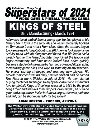 A subset of the Superstars of 2021, Our Pinball Legacy series of trading cards celebrates the 90th anniversary of the birth of coin-operated pinball (1931-2021). To honor this tremendous legacy, we invited more than 400 pinball aficionados to pose with their favorite pinball game for a trading card. And, on the back of the card, they wrote a 150-200 word biography, telling the story of their love for pinball while including in the text historical facts about the machine.