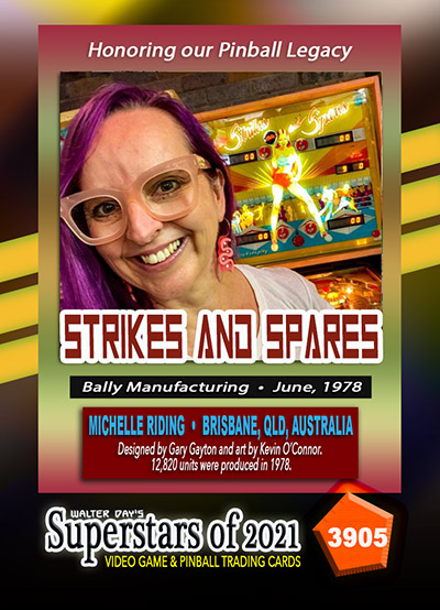 A subset of the Superstars of 2021, Our Pinball Legacy series of trading cards celebrates the 90th anniversary of the birth of coin-operated pinball (1931-2021). To honor this tremendous legacy, we invited more than 400 pinball aficionados to pose with their favorite pinball game for a trading card. And, on the back of the card, they wrote a 150-200 word biography, telling the story of their love for pinball while including in the text historical facts about the machine.