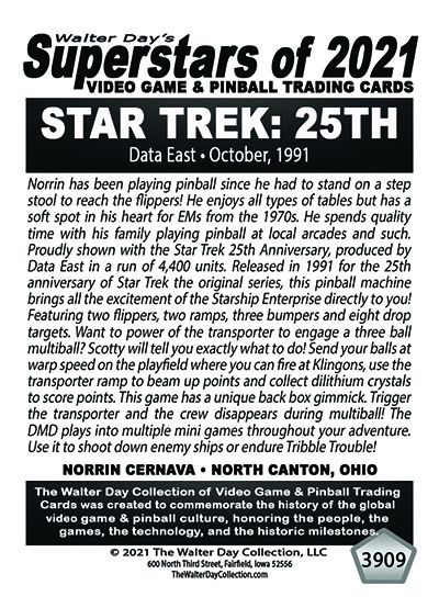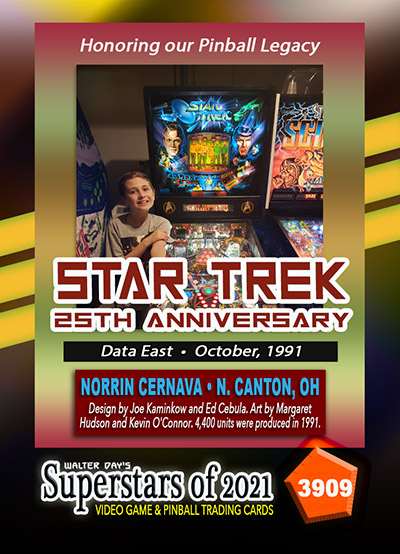 A subset of the Superstars of 2021, Our Pinball Legacy series of trading cards celebrates the 90th anniversary of the birth of coin-operated pinball (1931-2021). To honor this tremendous legacy, we invited more than 400 pinball aficionados to pose with their favorite pinball game for a trading card. And, on the back of the card, they wrote a 150-200 word biography, telling the story of their love for pinball while including in the text historical facts about the machine.