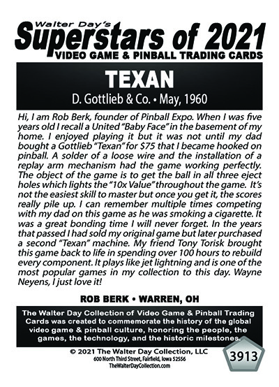 A subset of the Superstars of 2021, Our Pinball Legacy series of trading cards celebrates the 90th anniversary of the birth of coin-operated pinball (1931-2021). To honor this tremendous legacy, we invited more than 400 pinball aficionados to pose with their favorite pinball game for a trading card. And, on the back of the card, they wrote a 150-200 word biography, telling the story of their love for pinball while including in the text historical facts about the machine.