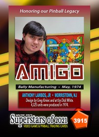 A subset of the Superstars of 2021, Our Pinball Legacy series of trading cards celebrates the 90th anniversary of the birth of coin-operated pinball (1931-2021). To honor this tremendous legacy, we invited more than 400 pinball aficionados to pose with their favorite pinball game for a trading card. And, on the back of the card, they wrote a 150-200 word biography, telling the story of their love for pinball while including in the text historical facts about the machine.