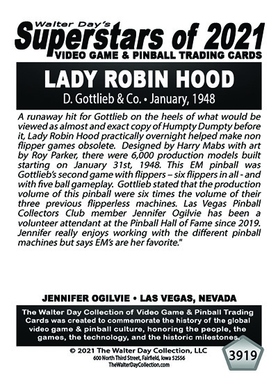 A subset of the Superstars of 2021, Our Pinball Legacy series of trading cards celebrates the 90th anniversary of the birth of coin-operated pinball (1931-2021). To honor this tremendous legacy, we invited more than 400 pinball aficionados to pose with their favorite pinball game for a trading card. And, on the back of the card, they wrote a 150-200 word biography, telling the story of their love for pinball while including in the text historical facts about the machine.