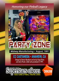 A subset of the Superstars of 2021, Our Pinball Legacy series of trading cards celebrates the 90th anniversary of the birth of coin-operated pinball (1931-2021). To honor this tremendous legacy, we invited more than 400 pinball aficianados to pose with their favorite pinball game for a trading card. And, on the back of the card, they wrote a 150-200 word biography, telling the story of their love for pinball while including in the text historical facts about the machine.