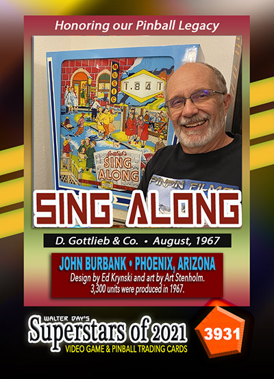 A subset of the Superstars of 2021, Our Pinball Legacy series of trading cards celebrates the 90th anniversary of the birth of coin-operated pinball (1931-2021). To honor this tremendous legacy, we invited more than 400 pinball aficionados to pose with their favorite pinball game for a trading card. And, on the back of the card, they wrote a 150-200 word biography, telling the story of their love for pinball while including in the text historical facts about the machine.