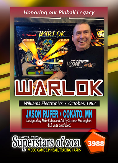A subset of the Superstars of 2021, Our Pinball Legacy series of trading cards celebrates the 90th anniversary of the birth of coin-operated pinball (1931-2021). To honor this tremendous legacy, we invited more than 400 pinball aficionados to pose with their favorite pinball game for a trading card. And, on the back of the card, they wrote a 150-200 word biography, telling the story of their love for pinball while including in the text historical facts about the machine.