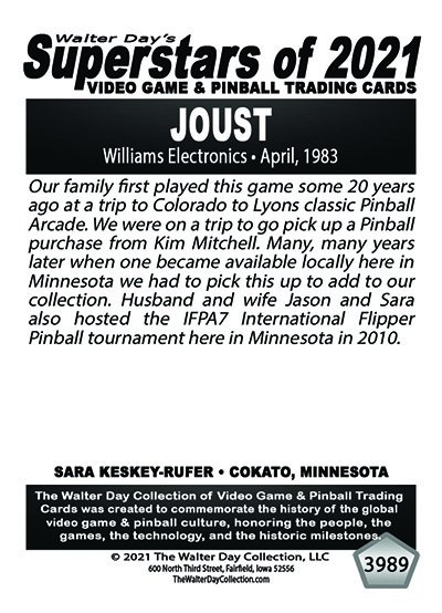 A subset of the Superstars of 2021, Our Pinball Legacy series of trading cards celebrates the 90th anniversary of the birth of coin-operated pinball (1931-2021). To honor this tremendous legacy, we invited more than 400 pinball aficionados to pose with their favorite pinball game for a trading card. And, on the back of the card, they wrote a 150-200 word biography, telling the story of their love for pinball while including in the text historical facts about the machine.
