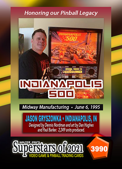 A subset of the Superstars of 2021, Our Pinball Legacy series of trading cards celebrates the 90th anniversary of the birth of coin-operated pinball (1931-2021). To honor this tremendous legacy, we invited more than 400 pinball aficionados to pose with their favorite pinball game for a trading card. And, on the back of the card, they wrote a 150-200 word biography, telling the story of their love for pinball while including in the text historical facts about the machine.