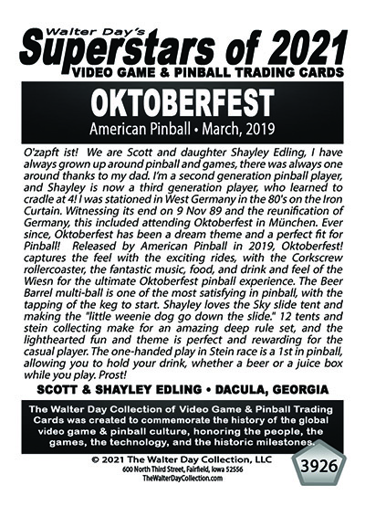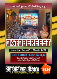 A subset of the Superstars of 2021, Our Pinball Legacy series of trading cards celebrates the 90th anniversary of the birth of coin-operated pinball (1931-2021). To honor this tremendous legacy, we invited more than 400 pinball aficionados to pose with their favorite pinball game for a trading card. And, on the back of the card, they wrote a 150-200 word biography, telling the story of their love for pinball while including in the text historical facts about the machine.
