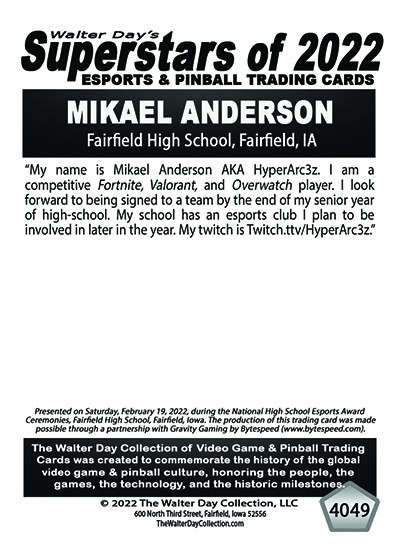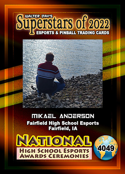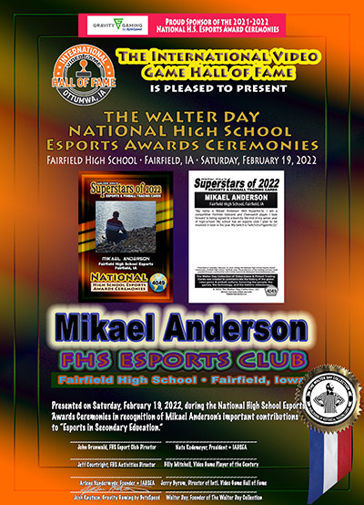 This Award and Trading Card was presented on Saturday, February 19, 2022, during the 1st Annual WALTER DAY NATIONAL HIGH SCHOOL ESPORTS AWARDS CEREMONIES, held at Fairfield High School, Fairfield, Iowa.