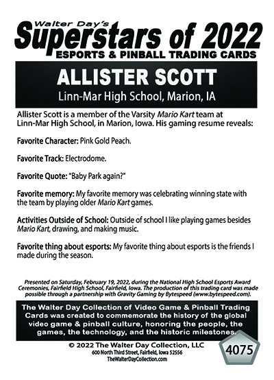 This Award and Trading Card was presented on Saturday, February 19, 2022, during the 1st Annual WALTER DAY NATIONAL HIGH SCHOOL ESPORTS AWARDS CEREMONIES, held at Fairfield High School, Fairfield, Iowa.