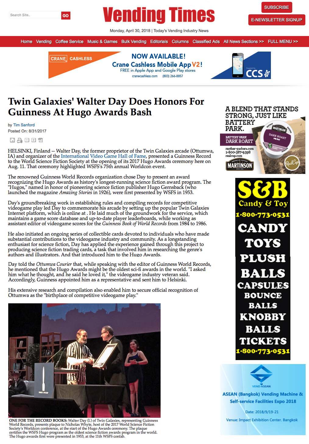 Twin Galaxies' Walter Day Does Honors For Guinness At Hugo Awards Bash