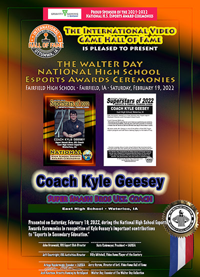 This Award and Trading Card was presented on Saturday, February 19, 2022, during the 1st Annual WALTER DAY NATIONAL HIGH SCHOOL ESPORTS AWARDS CEREMONIES, held at Fairfield High School, Fairfield, Iowa.