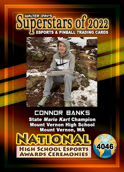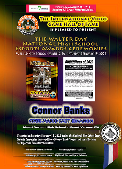 This Award and Trading Card was presented on Saturday, February 19, 2022, during the 1st Annual WALTER DAY NATIONAL HIGH SCHOOL ESPORTS AWARDS CEREMONIES, held at Fairfield High School, Fairfield, Iowa.