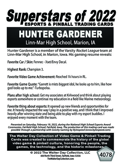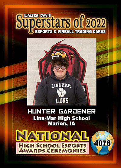 This Award and Trading Card was presented on Saturday, February 19, 2022, during the 1st Annual WALTER DAY NATIONAL HIGH SCHOOL ESPORTS AWARDS CEREMONIES, held at Fairfield High School, Fairfield, Iowa.