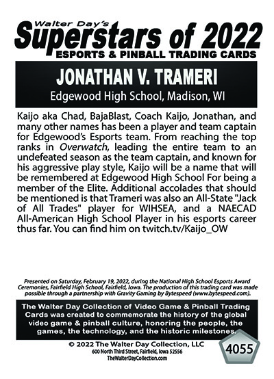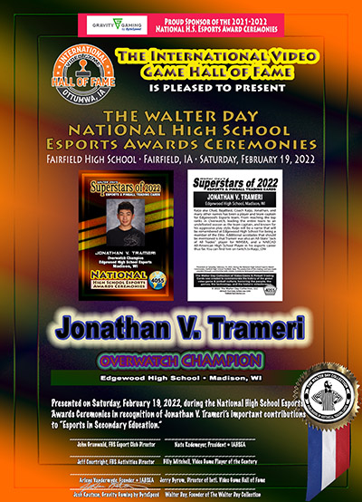 This Award and Trading Card was presented on Saturday, February 19, 2022, during the 1st Annual WALTER DAY NATIONAL HIGH SCHOOL ESPORTS AWARDS CEREMONIES, held at Fairfield High School, Fairfield, Iowa.