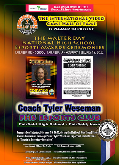 This Award and Trading Card was presented on Saturday, February 19, 2022, during the 1st Annual WALTER DAY NATIONAL HIGH SCHOOL ESPORTS AWARDS CEREMONIES, held at Fairfield High School, Fairfield, Iowa.