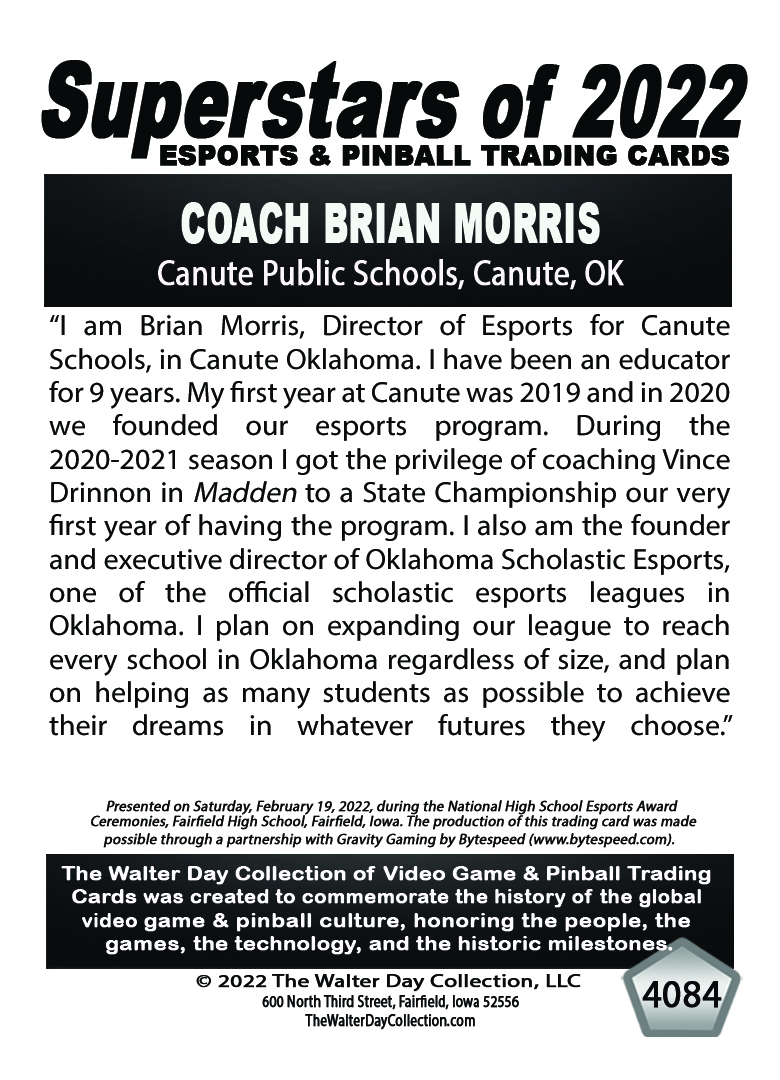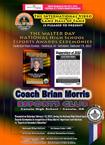 This Award and Trading Card was presented on Saturday, February 19, 2022, during the 1st Annual WALTER DAY NATIONAL HIGH SCHOOL ESPORTS AWARDS CEREMONIES, held at Fairfield High School, Fairfield, Iowa.
