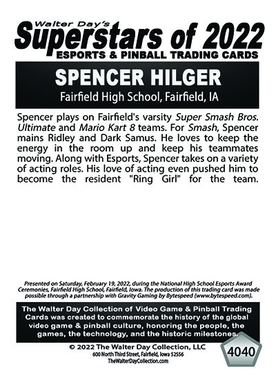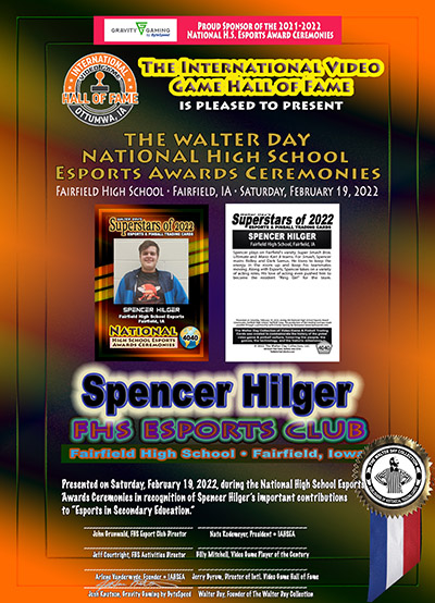 This Award and Trading Card was presented on Saturday, February 19, 2022, during the 1st Annual WALTER DAY NATIONAL HIGH SCHOOL ESPORTS AWARDS CEREMONIES, held at Fairfield High School, Fairfield, Iowa.