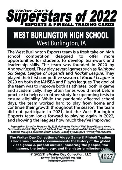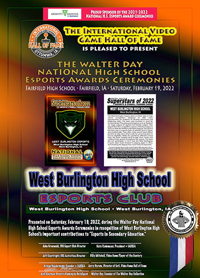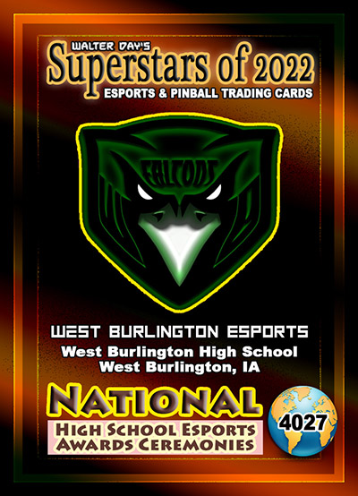 This Award and Trading Card was presented on Saturday, February 19, 2022, during the 1st Annual WALTER DAY NATIONAL HIGH SCHOOL ESPORTS AWARDS CEREMONIES, held at Fairfield High School, Fairfield, Iowa.