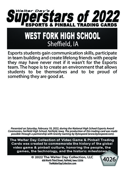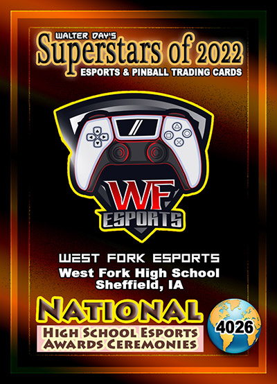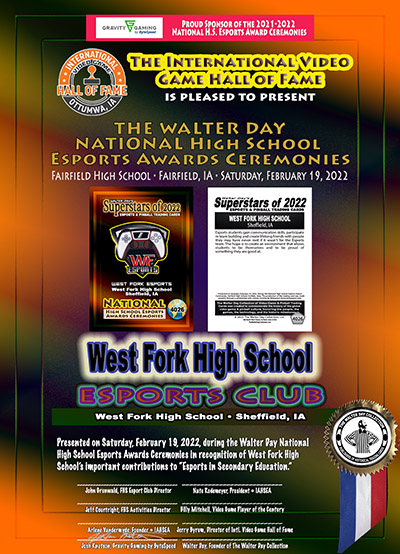 This Award and Trading Card was presented on Saturday, February 19, 2022, during the 1st Annual WALTER DAY NATIONAL HIGH SCHOOL ESPORTS AWARDS CEREMONIES, held at Fairfield High School, Fairfield, Iowa.