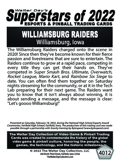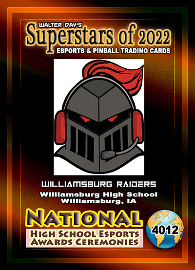 This Award and Trading Card was presented on Saturday, February 19, 2022, during the 1st Annual WALTER DAY NATIONAL HIGH SCHOOL ESPORTS AWARDS CEREMONIES, held at Fairfield High School, Fairfield, Iowa.